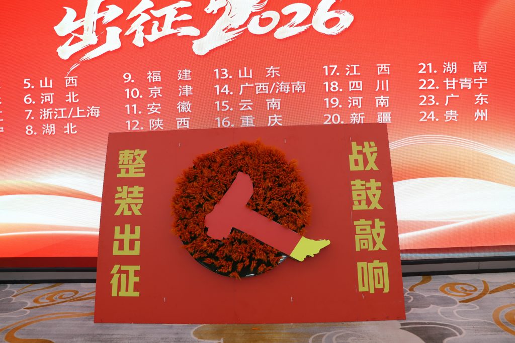儀式進(jìn)入最高潮——擊鼓出征環(huán)節(jié)震撼上演。銷(xiāo)售管理部部長(zhǎng)熊迪凱揮槌擊鼓,三聲鼓響如春雷炸裂,振奮人心。各省區(qū)團(tuán)隊(duì)回聲嘹亮,口號(hào)震天,鼓聲與吶喊交織成出征的號(hào)角。全體將士邁著堅(jiān)定有力的步伐,正式踏上2026年的嶄新征程。