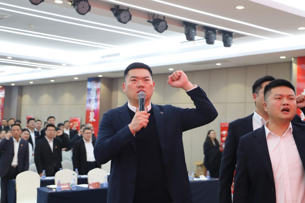 儀式在主持人劉永權(quán)莊重而富有感染力的開(kāi)場(chǎng)中拉開(kāi)帷幕,現(xiàn)場(chǎng)氣氛瞬間點(diǎn)燃。在各省區(qū)整齊列隊(duì)的見(jiàn)證下,公司總經(jīng)理李圳帶領(lǐng)全體市場(chǎng)營(yíng)銷(xiāo)將士高舉右拳,莊嚴(yán)宣誓。誓言錚錚,響徹全場(chǎng),這不僅是對(duì)年度目標(biāo)的堅(jiān)定承諾,更是中進(jìn)鐵軍勠力同心、使命必達(dá)的精神宣言。