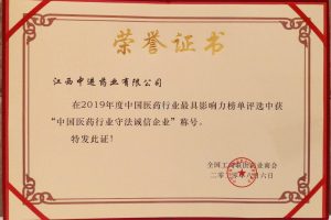 中進藥業(yè)榮獲“2019年度中國醫(yī)藥行業(yè)守法誠信企業(yè)”
