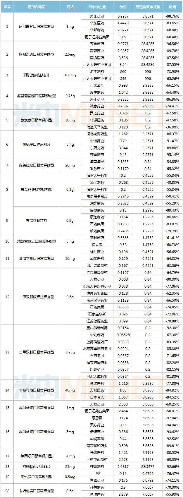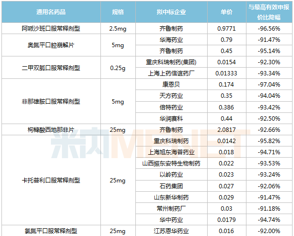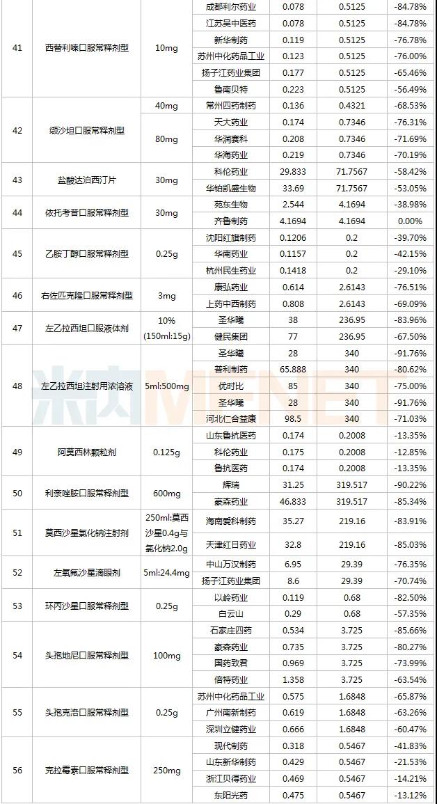 也有部分原研藥企有意參與,但無奈國產(chǎn)企業(yè)過于“瘋狂”而無奈出局,如阿扎胞苷注射劑,最高有效申報價996元/瓶,新基申報價736.5元/瓶,匯宇直接報出260元/瓶的超低價,正大天晴以346元/瓶處于第二順位;維格列汀最高有效申報價4.0893元/片,諾華申報價2.83元/片,7家國內(nèi)企業(yè)擬中選,齊魯以申報價0.45元/片處于第一順位;鹽酸達泊西汀片最高有效申報價71.7567元/片,Berlin-Chemie申報價62.667元/片,2家國內(nèi)企業(yè)擬中選,四川科倫報出29.833元/片的低價,處于第一順位等等。