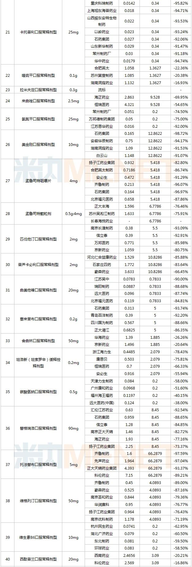 16個品種出現(xiàn)“大殺價”,降幅超過90%,其中齊魯?shù)陌⑦呱嘲唷⒖刀髫惖姆悄切郯?、重慶科瑞制藥的卡托普利、石藥及齊魯?shù)拿澜饎?、齊魯及先聲的托法替布降幅超過95%。