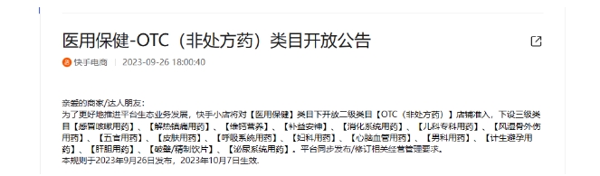 日前,快手電商發布《醫用保健-OTC(非處方藥)類目開放公告》(以下簡稱《公告》)稱,快手小店將對“醫用保健”類目下開放二級類目“OTC(非處方藥)”店鋪準入。