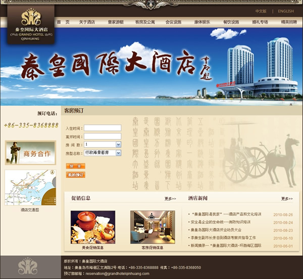 秦皇國際大酒店是秦皇島盛景集團(tuán)傾力打造,首都旅游集團(tuán)旗下北京貴賓樓飯店管理的一家海濱豪華五星級涉外酒店。酒店坐擁美麗的西海灘浴場,傲臨中國第一座世界級海岸長廊“金夢海灣”萬米碧浪金灘之上;東鄰國家足球訓(xùn)練基地;西倚新澳海底世界、海豚表演館等游樂場所;西北側(cè)即為2008奧運(yùn)會分賽場奧體中心;南接海濱公園并與渤海云天僅有百米之遙。酒店占地面積為1.7萬平方米,建筑面積為9萬平方米,總投資約5.8億元。樓宇呈21層雙塔形結(jié)構(gòu),為了觀海,酒店窗戶進(jìn)行錯位設(shè)計布置。