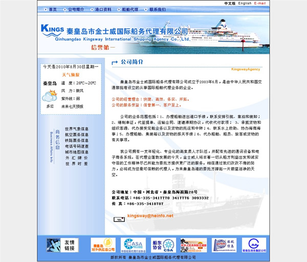 秦皇島市金士威國際船務代理有限公司成立于2003年6月,是由中華人民共和國交通部批準設立的從事國際船舶代理業務的企業。