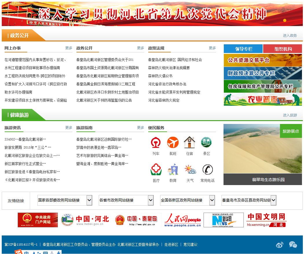北戴河新區轄有82公里金色細沙灘,占秦皇島全境162.7公里海岸線的半壁江山,自然天成了北方最優質沙灘活動場所—“黃金海岸”。湛藍海水與綿軟金沙相銜,唯美意境以“大海與沙漠的吻痕”權威評語,一舉成為《國家地理》評選的“中國最美的八大海岸”之一。