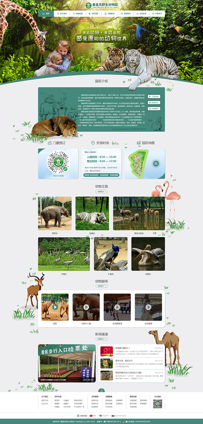 秦皇島野生動物園始建于1995年,座落于綠樹金沙環碧海的北戴河海濱國家森林公園內,與淺水灣浴場隔路相望,步行2分鐘即可到達,占地面積3500余畝,是目前我國城市規劃中,占地面積大、森林覆蓋率高、自然環境優美的野生動物園。園區放養著120余種4000余頭(只)來自世界各地的珍禽名獸以及我們國家一、二級保護動物。野生動物園分為籠養區、猛獸區,非洲風情園,中心廣場萌寵樂園、草食動物區和步行游覽區六個動物展區,可自駕或乘坐園區內觀光車參觀游覽。動物園充分利用這里的林海、綠地,模仿各種動物的原生環境將動物分區隔離散養,營造了返璞歸真、回歸自然的氛圍,形成人與自然和諧相融的旅游特色。