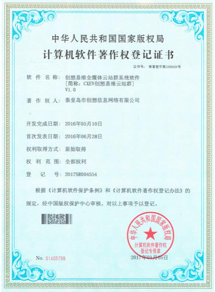創(chuàng)想易維全媒體云站群系統(tǒng)軟件著作權(quán)證書日前正式獲得國(guó)家版權(quán)局批準(zhǔn),創(chuàng)想公司在云平臺(tái)、智慧型、大數(shù)據(jù)應(yīng)用的自主產(chǎn)品研發(fā)的道路上將奮勇前進(jìn),越飛越高。